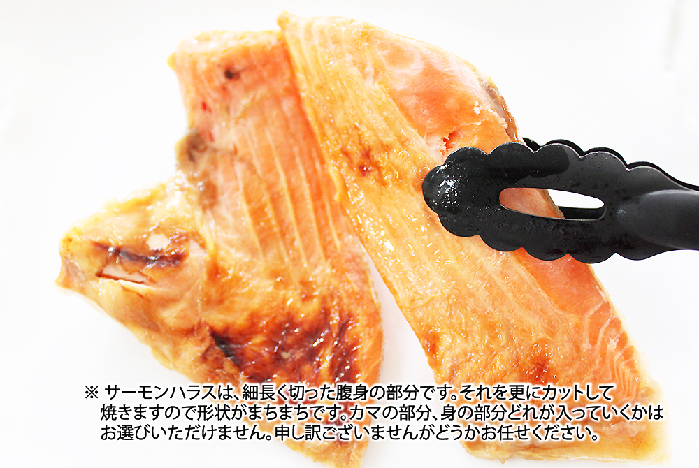 ※サーモンハラスは、細長く切った腹身の部分です。それをさらにカットして焼きますので形状がまちまちです。カマの部分、身の部分どれが入っていくかはお選びいただけません。申し訳ございませんがどうかお任せください。