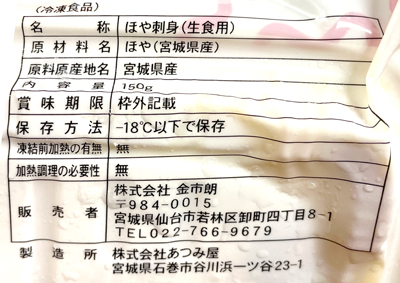 刺身 お刺身ほや [冷凍] 販売価格 980円(税込み) 会員価格 (税込み) 通常価格 (税込み) 在庫 商品コード 5941 JANコード 数量 - + カートに入れる お気に入りリストへ追加する カテゴリー 刺身 季節のイチオシ 店長のおすすめ 冷凍便 殻をむいたまんまのホヤ。ほや漁師が水揚げ3時間以内に処理加工し、活きたまま急速冷凍。生の美味しさ・食感そのままの、活ほやです。 ↑解凍後はお好みに切ってお召し上がりください。 津軽弘前市場 ハマダ海産 会社概要 実店舗紹介 ▼Facebook 津軽弘前市場 ハマダ海産 2025年10月 日 月 火 水 木 金 土 1 2 3 4 5 6 7 8 9 10 11 12 13 14 15 16 17 18 19 20 21 22 23 24 25 26 27 28 29 30 31 2025年11月 日 月 火 水 木 金 土 1 2 3 4 5 6 7 8 9 10 11 12 13 14 15 16 17 18 19 20 21 22 23 24 25 26 27 28 29 30 発送休業日(通販部は営業:10-17時) 営業(実店舗8-18時/通販部10-17時) ショッピングガイド 特定商取引法に基づく表記 個人情報保護方針 送料について 会員規約 お問合せ