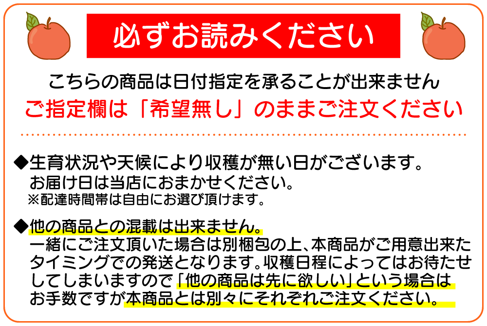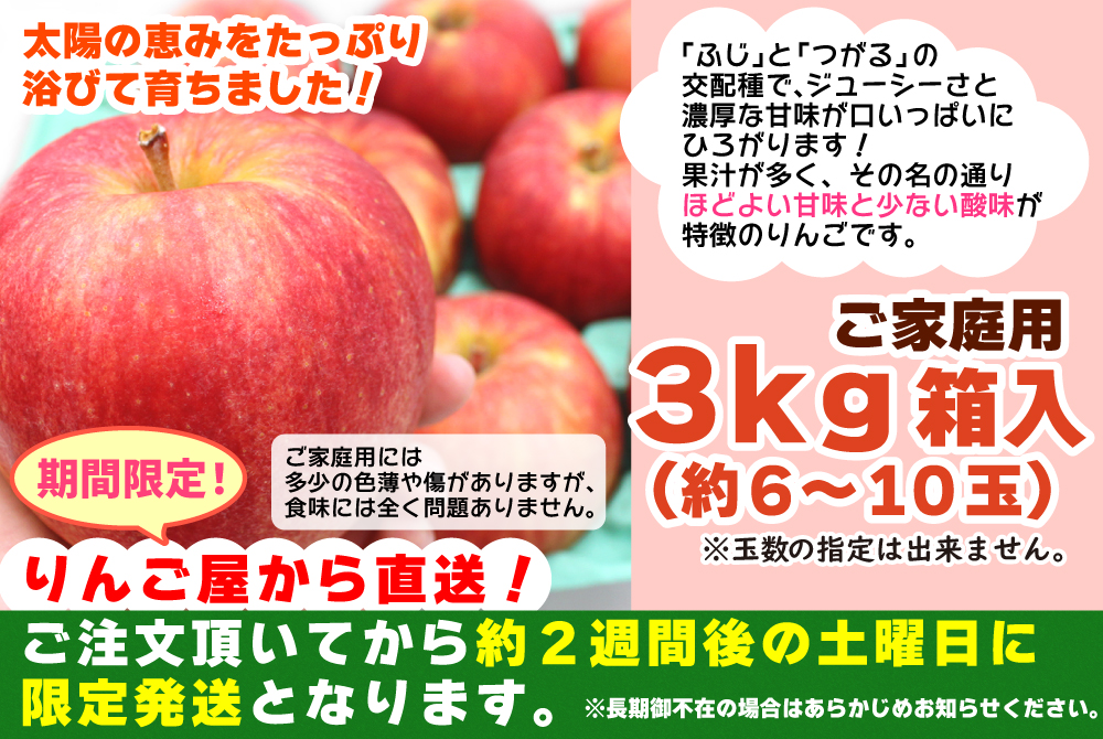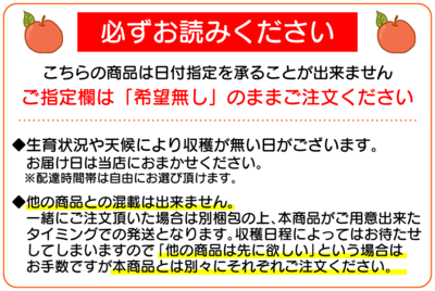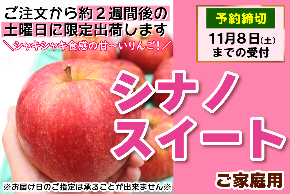お菓子・ジュース りんご・シナノスイート 3kg [冷蔵] 販売価格 4,600円(税込み) 会員価格 (税込み) 通常価格 (税込み) 在庫 98 商品コード 11006 JANコード 数量 - + カートに入れる カテゴリー お菓子・ジュース 季節のイチオシ 店長のおすすめ 個別送料 0円 販売期間 ~2025/11/08 23:55 <予約商品です>(1回目は10月25日(土)出荷予定)ご用意出来次第の発送となります。こちらは「ご家庭用」のため、多少のキズ・色むら・ツル割れがあります。食味には全く問題ありませんので、ご理解のほど、よろしくお願いいたします。 冷蔵便 秋のお楽しみりんご第三弾! 秋の味覚「りんご」! りんごは年々品種が増え、あれもこれも…と食べるのに忙しい時期です。 「いろんな種類のりんごを食べ比べてみたい!」 そんなお客様の声にお応えして、青森りんごのプロ「山金りんご」の店長が厳選した、その時々の旬のりんごをご紹介しております。 --------------- 今回は第三弾!『シナノスイート3kg』の登場です。 採りたての旬の時期だけの発送となります。りんご屋から直接発送致しますので、お届け日はご指定頂けません。(ご注文から約2週間後の土曜日に限定発送致します。)どうかご了承ください。 --------------- ※今回ご都合が合わない方は、後日また違う品種のりんごもご紹介しますので、次の機会にご期待ください。 --------------- 【送料込】沖縄を除く日本国内は、記載の金額で承ります。※こちらの商品を沖縄県へお届けの場合、追加送料として、別途1,500円かかります。 津軽弘前市場 ハマダ海産 会社概要 実店舗紹介 ▼Facebook 津軽弘前市場 ハマダ海産 2025年10月 日 月 火 水 木 金 土 1 2 3 4 5 6 7 8 9 10 11 12 13 14 15 16 17 18 19 20 21 22 23 24 25 26 27 28 29 30 31 2025年11月 日 月 火 水 木 金 土 1 2 3 4 5 6 7 8 9 10 11 12 13 14 15 16 17 18 19 20 21 22 23 24 25 26 27 28 29 30 発送休業日(通販部は営業:10-17時) 営業(実店舗8-18時/通販部10-17時) ショッピングガイド 特定商取引法に基づく表記 個人情報保護方針 送料について 会員規約 お問合せ