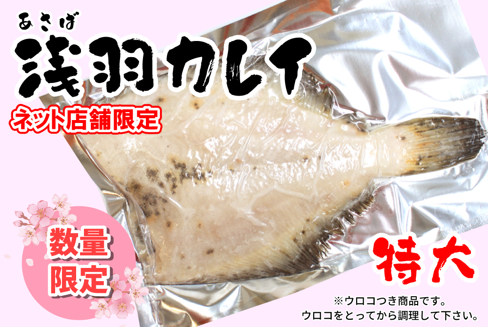 海のもの 浅羽カレイ(加熱用)[冷凍] 販売価格 350円(税込み) 会員価格 (税込み) 通常価格 (税込み) 在庫 12 商品コード 00315 JANコード 数量 - + カートに入れる カテゴリー 海のもの 季節のイチオシ 店長のおすすめ 冷凍便 大きい浅羽カレイが入荷しました!! こちらは単品1袋です。お得な3袋セットはこちら 頭を落として冷凍・真空パックでお届けします。ウロコはついたままなので、ご自宅で解凍後にウロコをとってから加熱してお召し上がり下さい。※味はついておりません。煮付けや塩焼きにお使い下さい。 津軽弘前市場 ハマダ海産 会社概要 実店舗紹介 ▼Facebook 津軽弘前市場 ハマダ海産 2026年03月 日 月 火 水 木 金 土 1 2 3 4 5 6 7 8 9 10 11 12 13 14 15 16 17 18 19 20 21 22 23 24 25 26 27 28 29 30 31 2026年04月 日 月 火 水 木 金 土 1 2 3 4 5 6 7 8 9 10 11 12 13 14 15 16 17 18 19 20 21 22 23 24 25 26 27 28 29 30 虹のマート休業日 虹のマート臨時休業 虹のマート営業:8-18時(通販部:10-17時) ショッピングガイド 特定商取引法に基づく表記 個人情報保護方針 送料について 会員規約 お問合せ