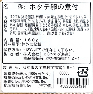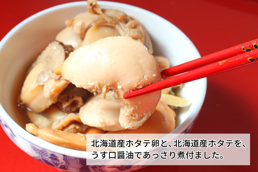 煮魚・惣菜 ホタテ卵の煮付 [冷凍] 販売価格 680円(税込み) 会員価格 (税込み) 通常価格 (税込み) 在庫 商品コード 3034 JANコード 数量 - + カートに入れる お気に入りリストへ追加する カテゴリー 煮魚・惣菜 季節のイチオシ 店長のおすすめ 冷凍便 北海道産ホタテ卵・北海道産ホタテを薄口しょうゆで煮付ました。あっさり、生姜がきいてほっとする、家庭の味わいです。白いオスの子っこと赤いメスの子っこ。それぞれの食感をお楽しみください。 津軽弘前市場 ハマダ海産 会社概要 実店舗紹介 ▼Facebook 津軽弘前市場 ハマダ海産 2026年04月 日 月 火 水 木 金 土 1 2 3 4 5 6 7 8 9 10 11 12 13 14 15 16 17 18 19 20 21 22 23 24 25 26 27 28 29 30 2026年05月 日 月 火 水 木 金 土 1 2 3 4 5 6 7 8 9 10 11 12 13 14 15 16 17 18 19 20 21 22 23 24 25 26 27 28 29 30 31 虹のマート休業日 虹のマート臨時休業 虹のマート営業:8-18時(通販部:10-17時) ショッピングガイド 特定商取引法に基づく表記 個人情報保護方針 送料について 会員規約 お問合せ