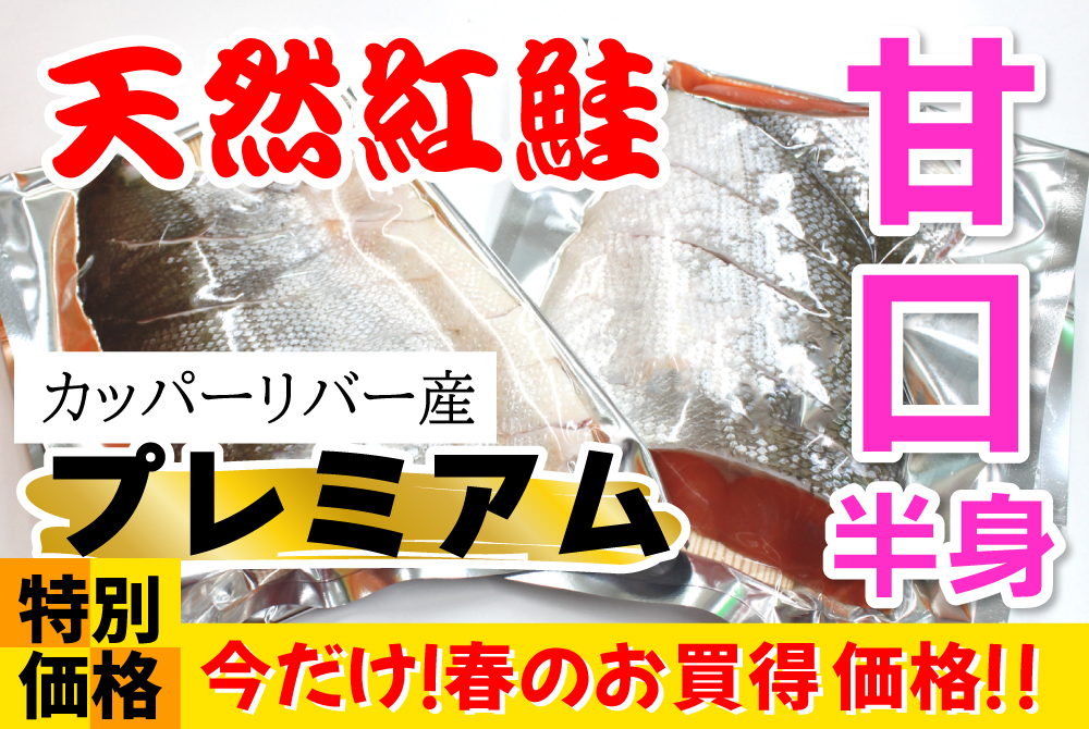 鮭 プレミアム 甘口・紅鮭 半身切身 [冷蔵・冷凍] 販売価格 5,000円(税込み) 会員価格 (税込み) 通常価格 5,500円(税込み) 在庫 商品コード 5215 JANコード 数量 - + カートに入れる お気に入りリストへ追加する カテゴリー 鮭 季節のイチオシ 店長のおすすめ 冷蔵便冷凍便 プレミアム天然紅鮭・半身切身パックです。アメリカ・アラスカのカッパーリバーの荒波にもまれて育った天然紅鮭。脂のりが抜群で、その美味しさから他国にはあまり出回らない鮭です。幸運なことに今回確保できました。貴重かつプレミアムな紅鮭を、この機会にぜひどうぞ。<こちらは甘口です> 当店の鮭は全て手切りしています。機械切のような斜めそぎ切りではなく、昔ながらの直角に近い切身です。そぎ切りでは、身の厚い・薄い部分が出るため焼いた時に部分的にパサつきます。手切りの良さは、焼いた時均一に火が通りふっくら焼き上がる点だと思っています。 ご注文を頂いてから切り分け、すぐに真空します。(頭・中骨は入りません)※この時点では冷蔵状態ですのでなるべく冷蔵便でお届けしたいのですが、同梱商品によっては冷凍になることもあります。ご家庭での保存も冷凍庫で問題ないのですが、冷凍→解凍→冷凍と温度変化を何度も繰り返しますと美味しくなくなります。また、塩加減も変わって行きますのでなるべく美味しいうちにお早めにお召し上がりください。また、もし冷凍状態の場合は冷蔵庫でゆっくり解凍し、完全に溶けてから焼いてくださるようお願いいたします。 必ず焼いてお召し上がりください。時々「マリネにできますか?」とお問合せを頂きますがお勧めしません。焼いてちょうど良い塩加減・脂乗りに仕上げております。是非、天然物の「焼き紅鮭」をご堪能下さい。 ちょっとお醤油をたらした大根おろしを添えて、ご飯に乗せて、ちょうど良い塩加減です。プレミアムな鮭ご飯をお楽しみください。 津軽弘前市場 ハマダ海産 会社概要 実店舗紹介 ▼Facebook 津軽弘前市場 ハマダ海産 2026年04月 日 月 火 水 木 金 土 1 2 3 4 5 6 7 8 9 10 11 12 13 14 15 16 17 18 19 20 21 22 23 24 25 26 27 28 29 30 2026年05月 日 月 火 水 木 金 土 1 2 3 4 5 6 7 8 9 10 11 12 13 14 15 16 17 18 19 20 21 22 23 24 25 26 27 28 29 30 31 虹のマート休業日 虹のマート臨時休業 虹のマート営業:8-18時(通販部:10-17時) ショッピングガイド 特定商取引法に基づく表記 個人情報保護方針 送料について 会員規約 お問合せ