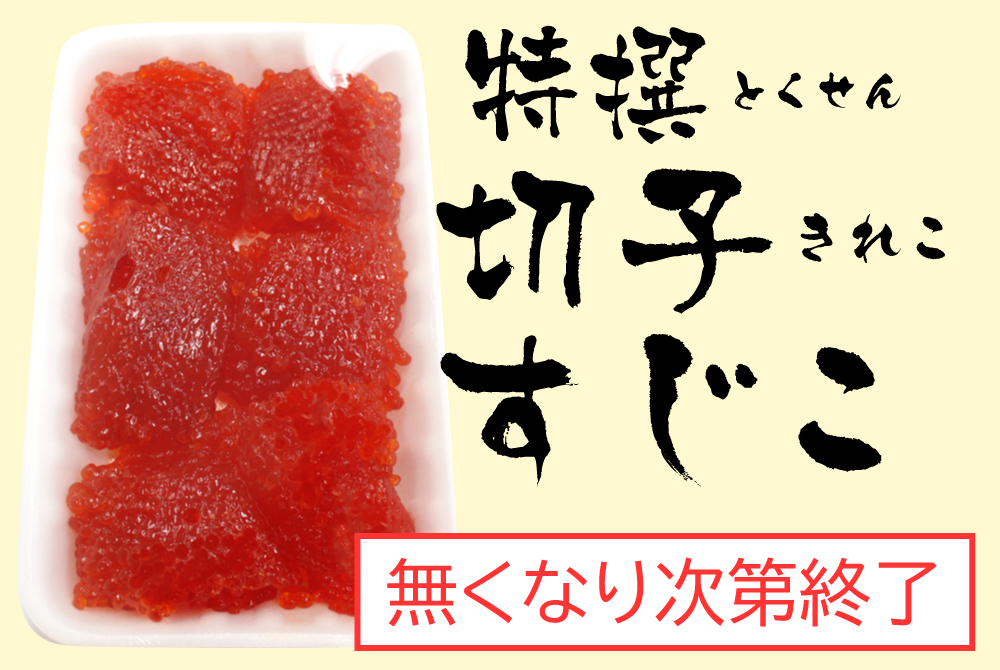 すじこ・いくら 特撰・切子すじこ [冷蔵・冷凍] 販売価格 5,000円(税込み) 会員価格 (税込み) 通常価格 (税込み) 在庫 133 商品コード 00418 JANコード 数量 - + カートに入れる お気に入りリストへ追加する カテゴリー すじこ・いくら 季節のイチオシ 店長のおすすめ 注文数制限 1 ~ 10 【3月27日より出荷予定】---------------------数量限定品です。長期のお取り置きは出来かねます。ご了承ください。冷蔵便冷凍便 一等ランクの美味しいすじこの「切子(きれこ)」です。-----------------------すじこが本当に品薄です!そのため、大変恐縮ではございますが、今回の「すじこ(切子)」は◆【5,000円】パックのみのお取り扱いとさせていただきます。※数量限定につき、お取り置きができない商品です。 津軽弘前市場 ハマダ海産 会社概要 実店舗紹介 ▼Facebook 津軽弘前市場 ハマダ海産 2026年03月 日 月 火 水 木 金 土 1 2 3 4 5 6 7 8 9 10 11 12 13 14 15 16 17 18 19 20 21 22 23 24 25 26 27 28 29 30 31 2026年04月 日 月 火 水 木 金 土 1 2 3 4 5 6 7 8 9 10 11 12 13 14 15 16 17 18 19 20 21 22 23 24 25 26 27 28 29 30 虹のマート休業日 虹のマート臨時休業 虹のマート営業:8-18時(通販部:10-17時) ショッピングガイド 特定商取引法に基づく表記 個人情報保護方針 送料について 会員規約 お問合せ