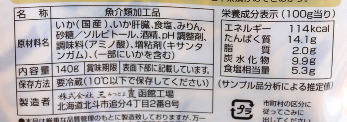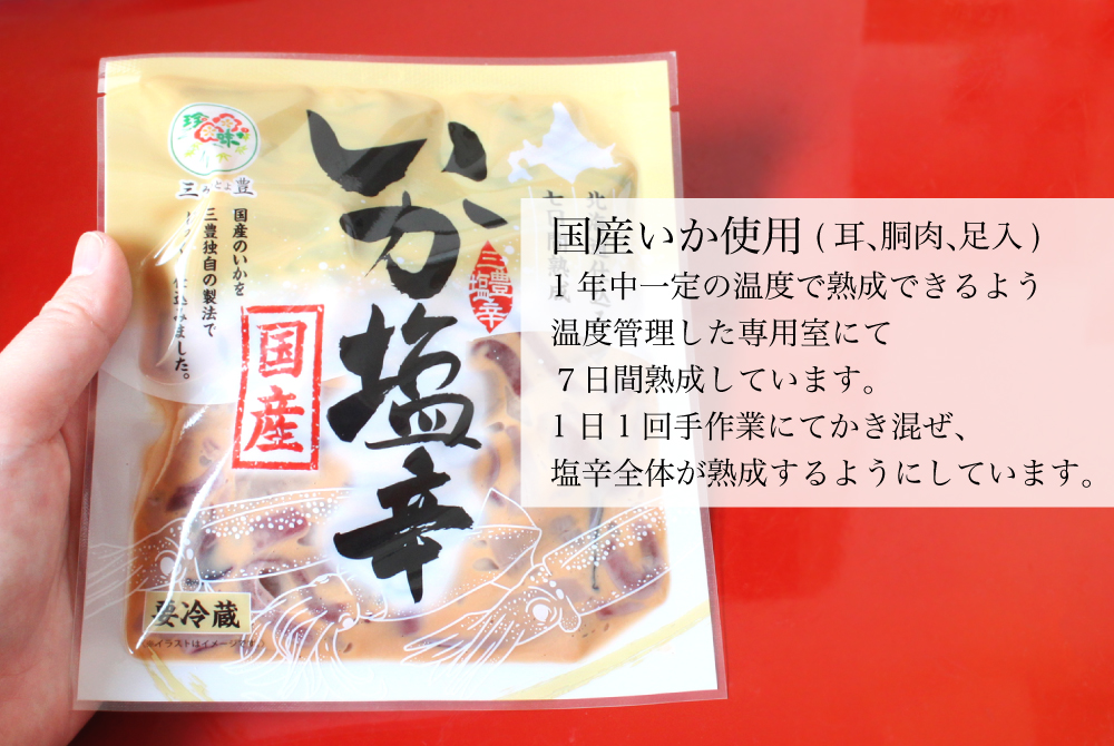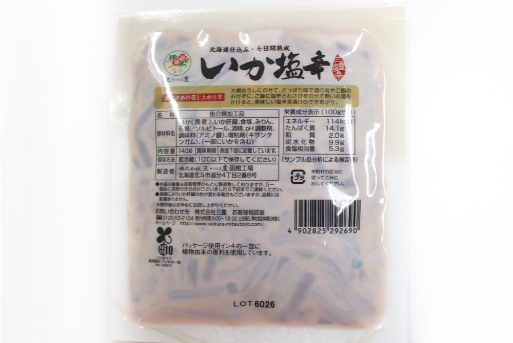 通の味・生干し魚 国産いか塩辛 140g [冷凍・冷蔵] 販売価格 540円(税込み) 会員価格 (税込み) 通常価格 (税込み) 在庫 商品コード 00424 JANコード 数量 - + カートに入れる お気に入りリストへ追加する カテゴリー 通の味・生干し魚 冷凍便冷蔵便 国産いかで造った塩辛です。 おすすめの召し上がり方大根おろしにのせて、さっぱりと酒の肴やごはんのおかずに。ご飯に塩辛とわさびをのせて熱いお湯をかけると、美味しい塩辛茶漬けのできあがり。 RECOMMENDEDおすすめ商品 さばの一夜干し [冷凍] 980円(税込み) 縞ほっけ一夜干し [冷凍] 1,980円(税込み) 赤魚の一夜干し [冷凍] 680円(税込み) 津軽弘前市場 ハマダ海産 会社概要 実店舗紹介 ▼Facebook 津軽弘前市場 ハマダ海産 2026年04月 日 月 火 水 木 金 土 1 2 3 4 5 6 7 8 9 10 11 12 13 14 15 16 17 18 19 20 21 22 23 24 25 26 27 28 29 30 2026年05月 日 月 火 水 木 金 土 1 2 3 4 5 6 7 8 9 10 11 12 13 14 15 16 17 18 19 20 21 22 23 24 25 26 27 28 29 30 31 虹のマート休業日 虹のマート営業:8-18時(通販部:10-17時) ショッピングガイド 特定商取引法に基づく表記 個人情報保護方針 送料について 会員規約 お問合せ
